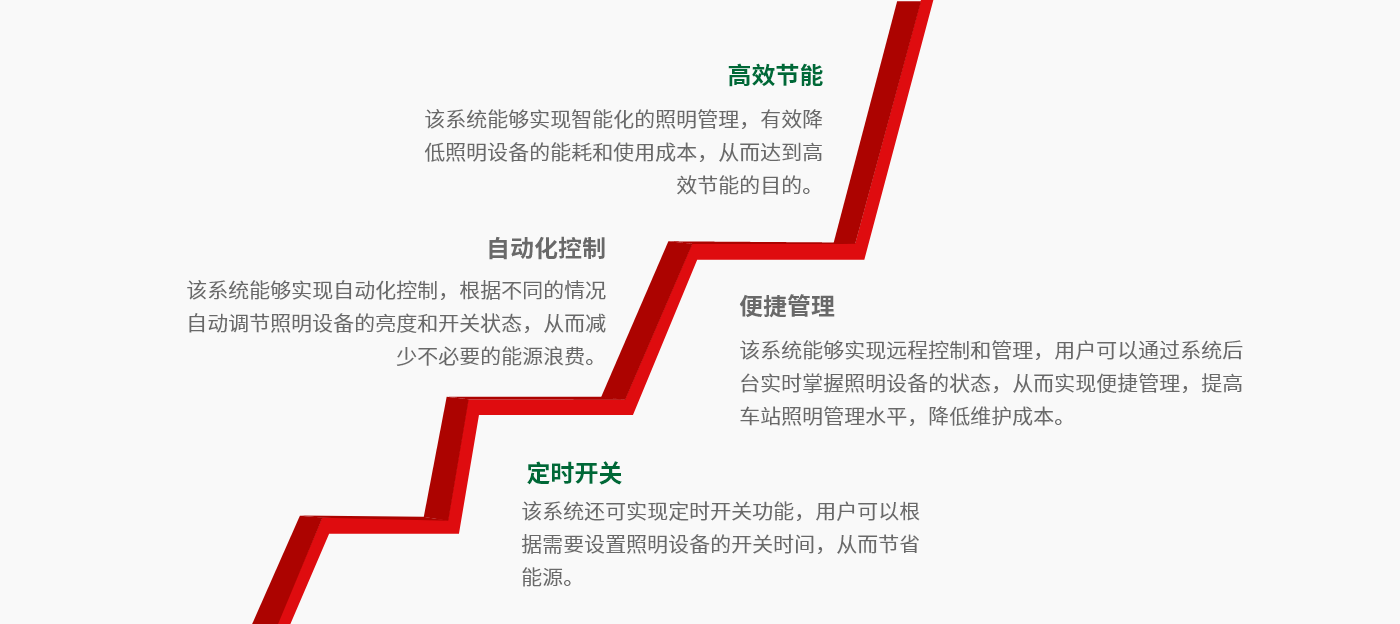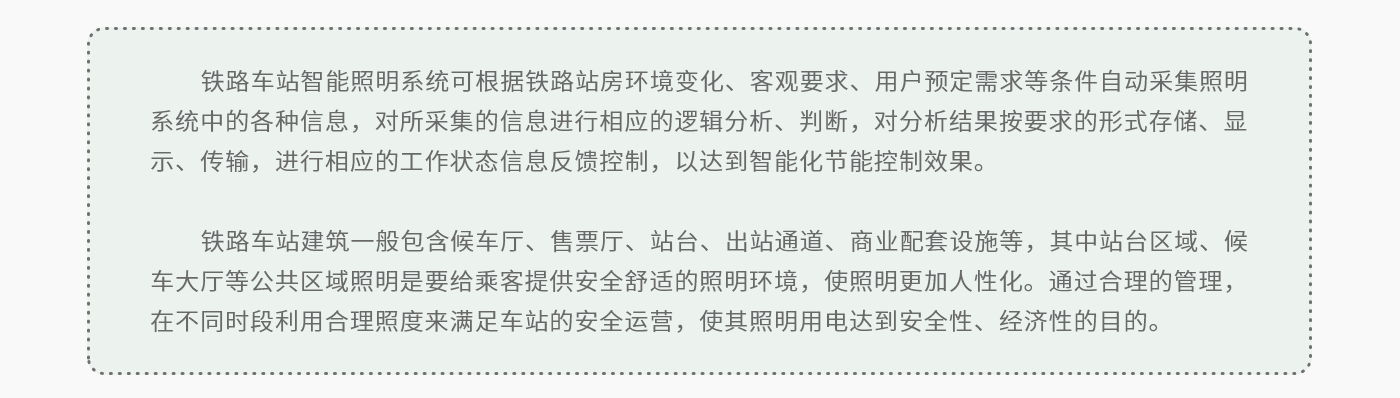 鐵路車站智能照明系統可根據鐵路站房環境變化、客觀要求、用戶預定需求等條件自動采集照明系統中的各種信息,對所采集的信息進行相應的邏輯分析、判斷,對分析結果按要求的形式存儲、顯示、傳輸,進行相應的工作狀態信息反饋控制,以達到智能化節能控制效果。