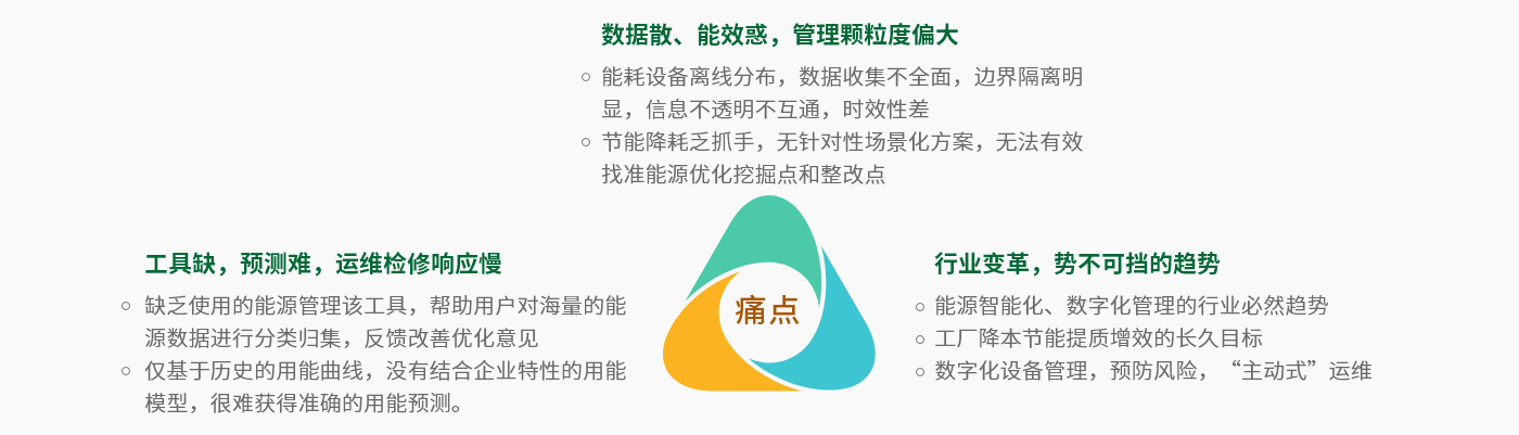 企業(yè)在生產(chǎn)運營過程中所用能耗大,各環(huán)節(jié)粗礦式經(jīng)營,成本居高不下,無法準(zhǔn)確定位關(guān)鍵癥結(jié)所在。工廠能源管理系統(tǒng)解決方案對企業(yè)使用的水、電、熱、蒸汽、燃?xì)獾雀黝惸芎挠嬃俊⒎治觯筛逦孬@悉不同設(shè)備、車間、產(chǎn)線、消耗等方面的能耗動態(tài)監(jiān)控和數(shù)據(jù)化管理,幫助用戶實現(xiàn)能耗統(tǒng)計分析,節(jié)能減排,避免“跑冒滴漏”現(xiàn)象,提高能源利用率,降低用戶成本,提高風(fēng)險預(yù)判能力。
